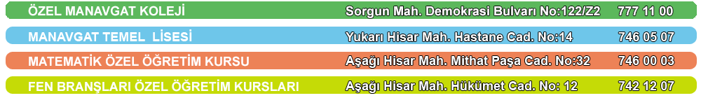 Okulumuzun Taşımacıyı Tespit faaliyetleri başladı. '' 2018 - 2019 Eğitim - Öğretim yılı Özel Manavgat Koleji Okul Servisi Çalıştırma İşi İlanı'' için 'burayı' tıklayınız.